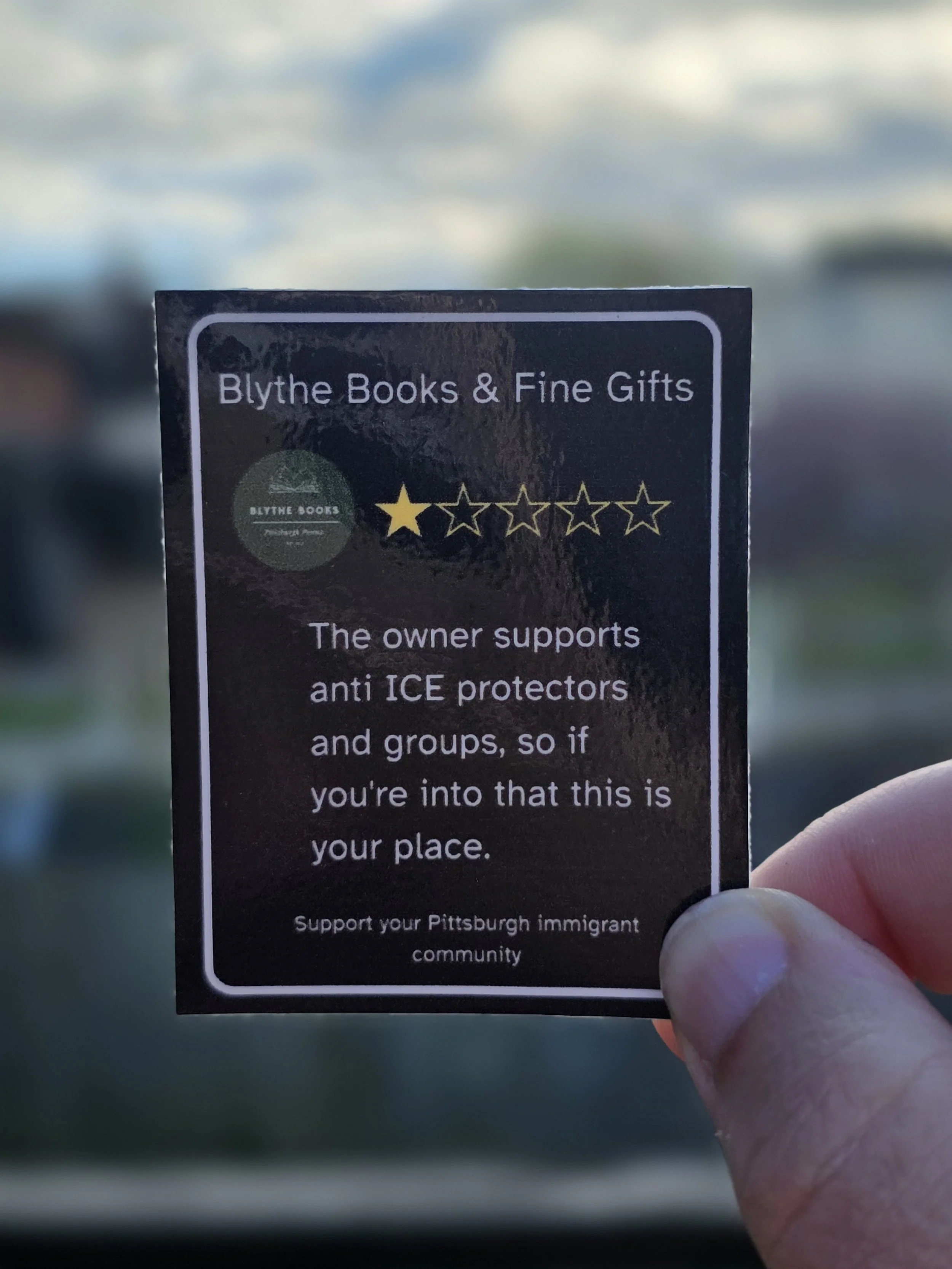 Celebrate Blythe Books’ first one-star review with a sticker featuring the review in all of its glory. The review advises people not to shop at the store if they are pro-ICE.